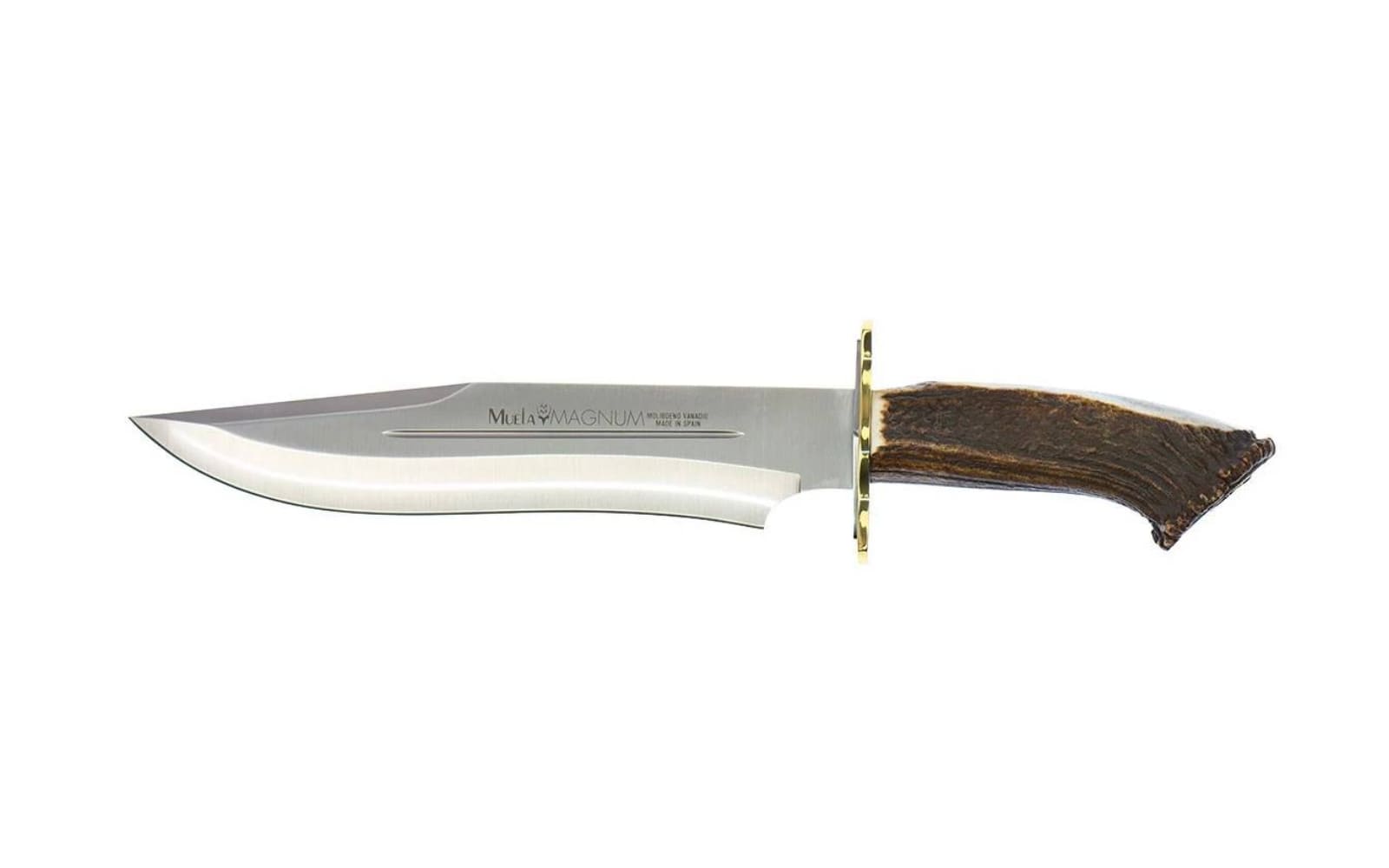 Muela knives are crafted using high-quality stainless steels like X50CrMoV15 and Damascus steel, combined with premium handle materials such as red stag antler, stabilized hardwoods, micarta, and exotic woods.